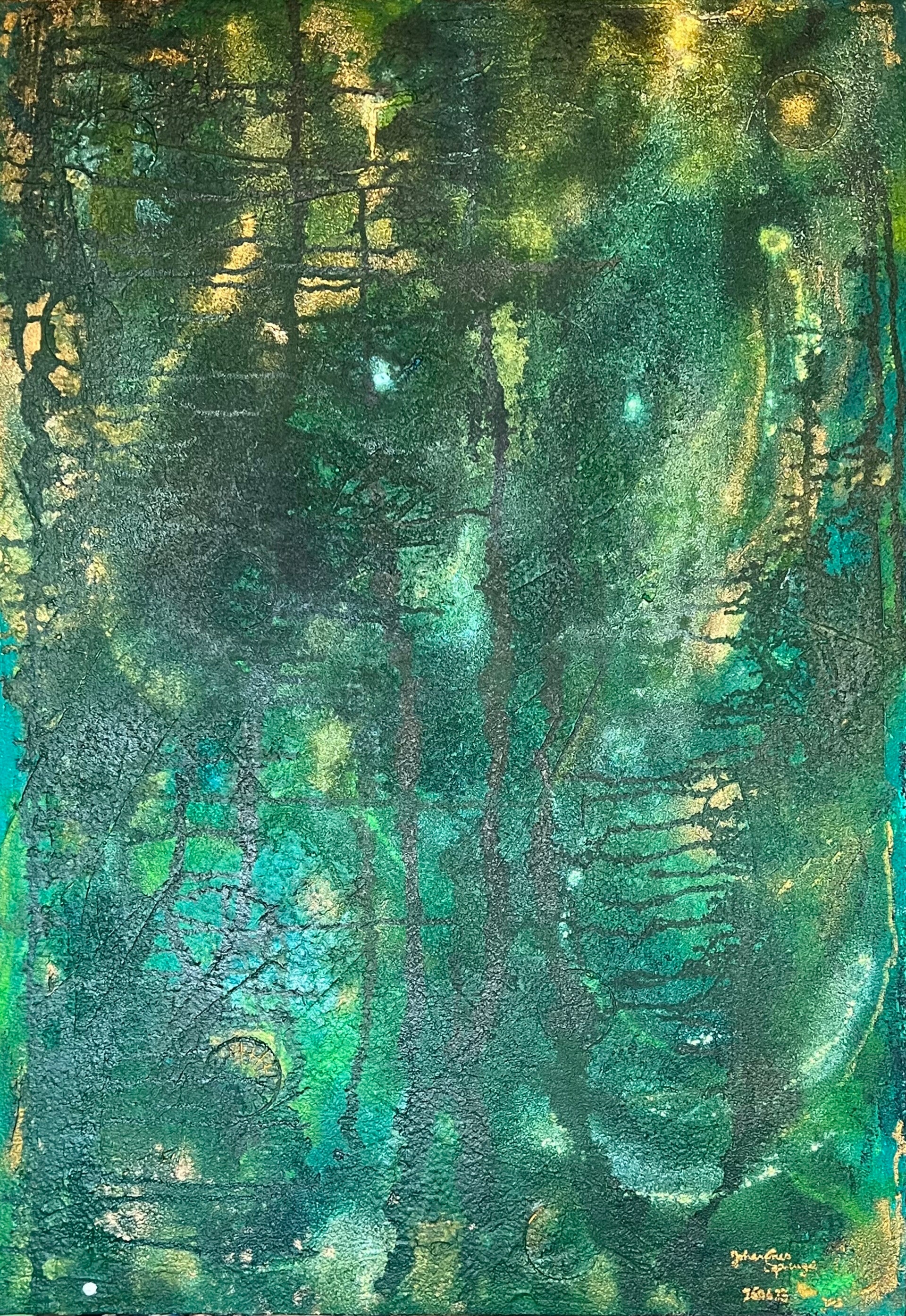 Freude im Wald (Goldenes Grün),; 70 x 100 cm; Acryl, Tusche et al auf Keilrahmen; o.R.